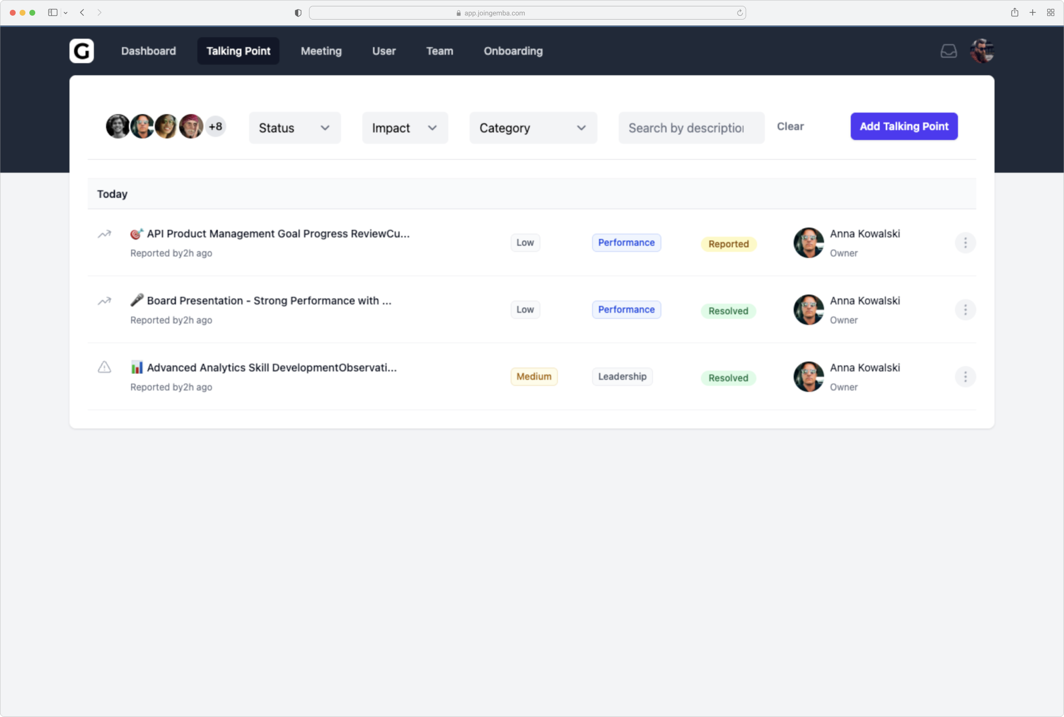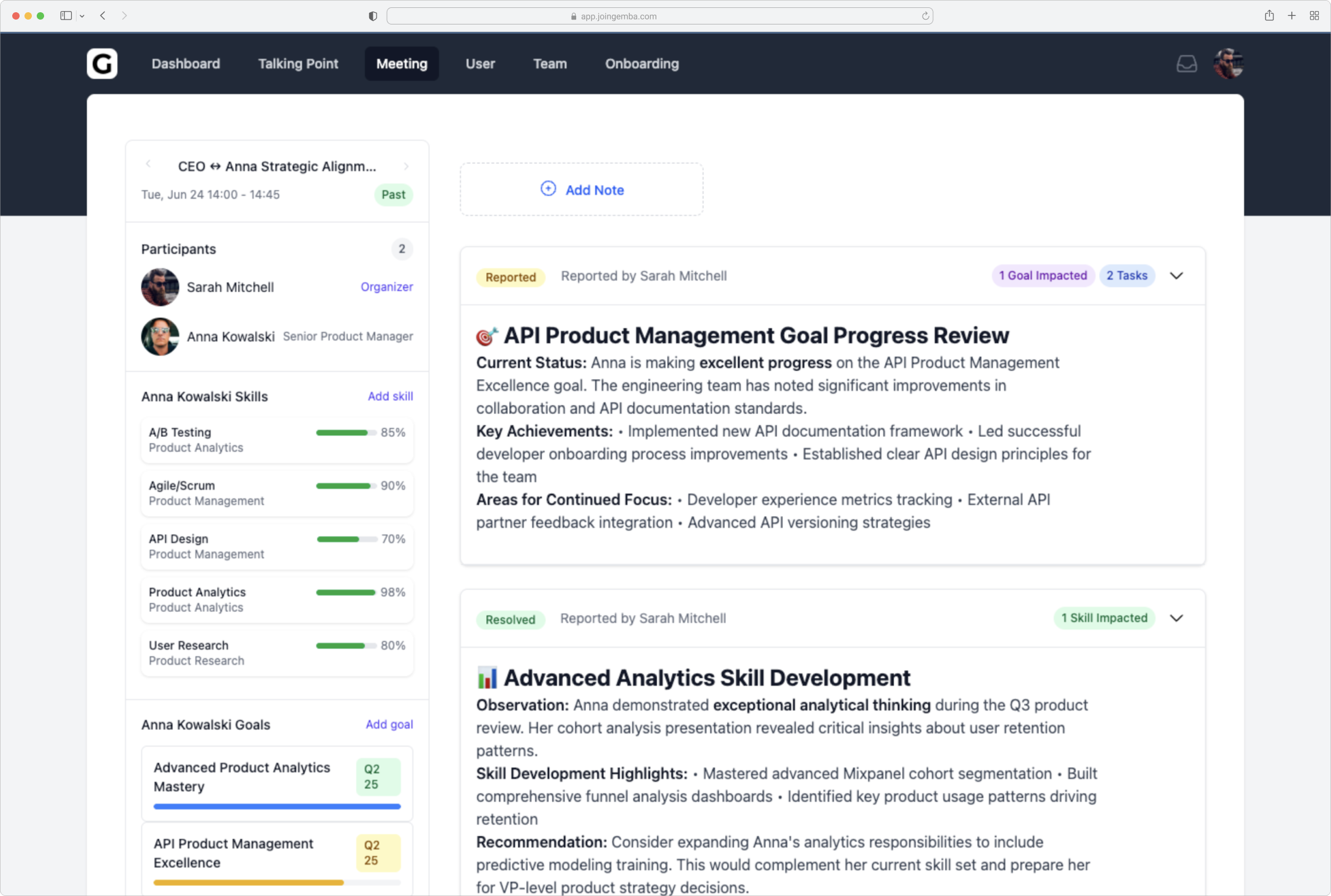 Notiere über die Woche Beobachtungen — Erfolge, Bedenken, Ideen. Gemba speichert sie als Gesprächsthemen für dein nächstes 1:1.