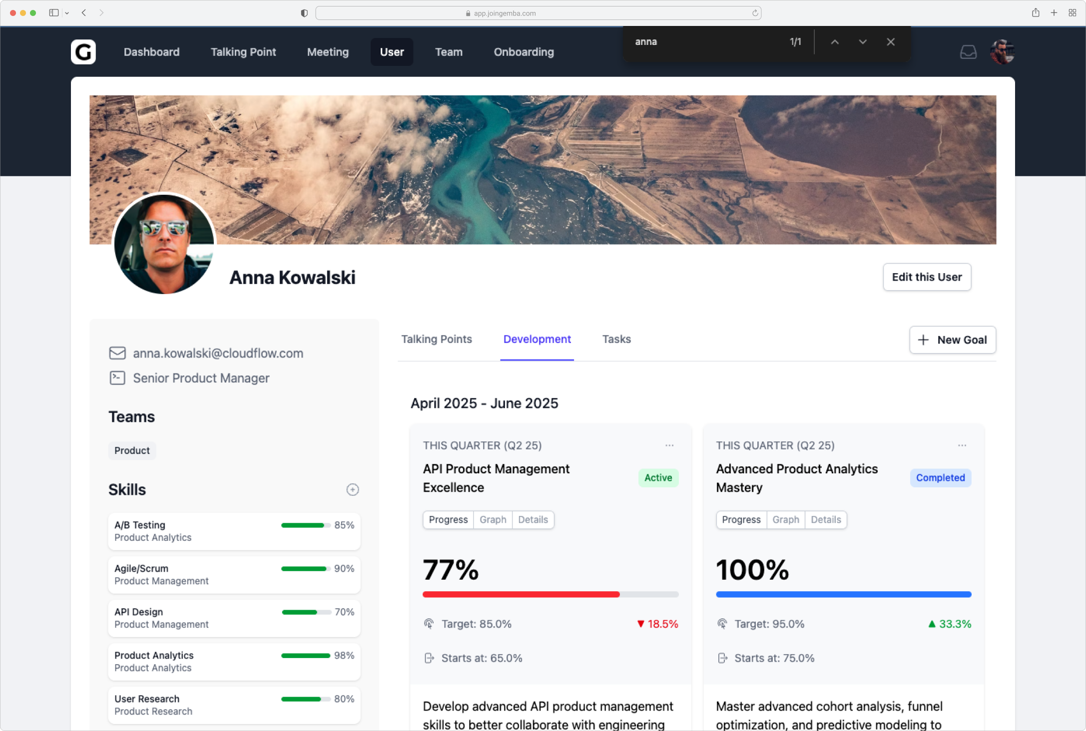 "Gemba hat unseren Talententwicklungsprozess wunderbar optimiert. Der strukturierte Ansatz für 1:1s und Zielverfolgung hat unser Teammanagement so viel effektiver und messbarer gemacht."