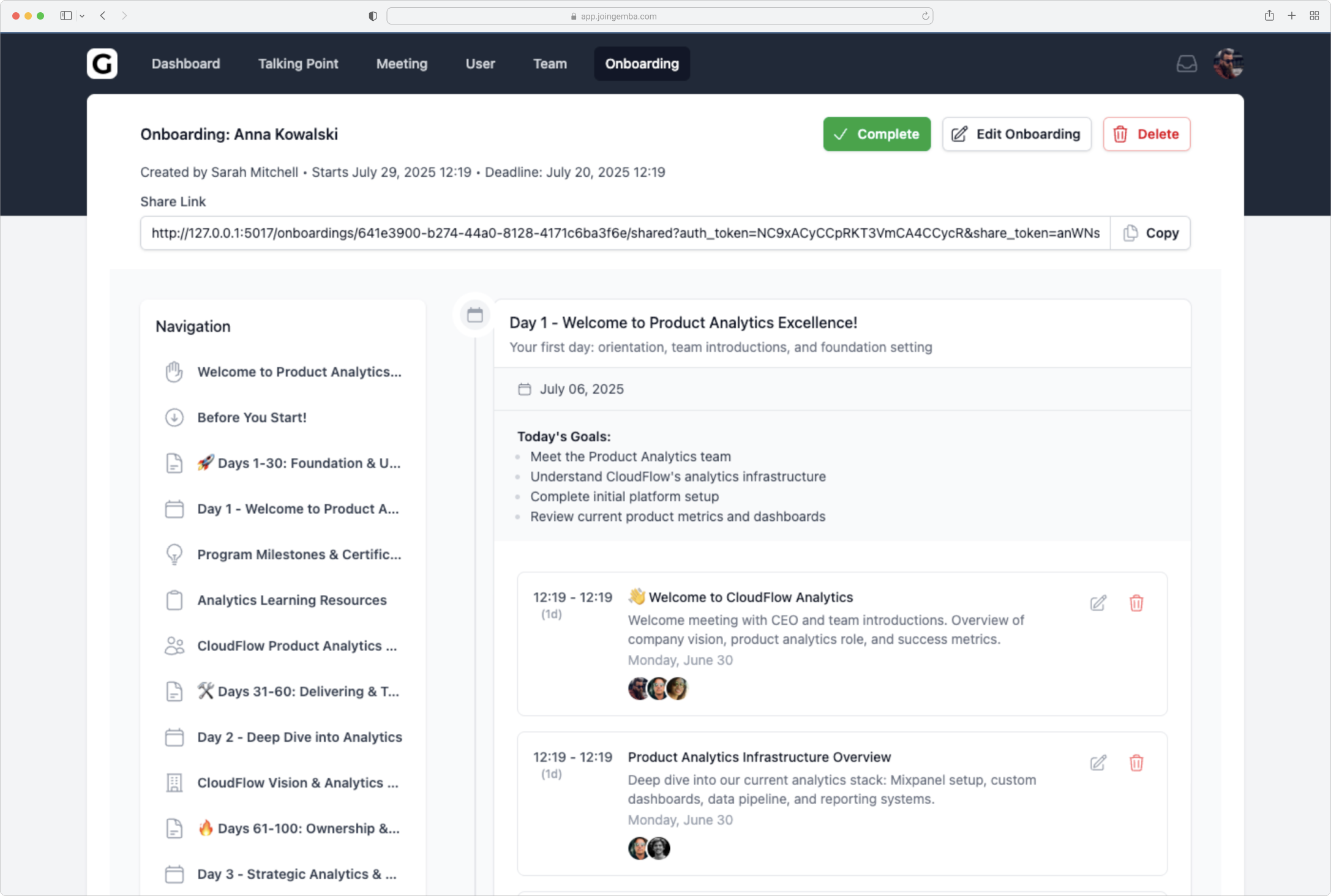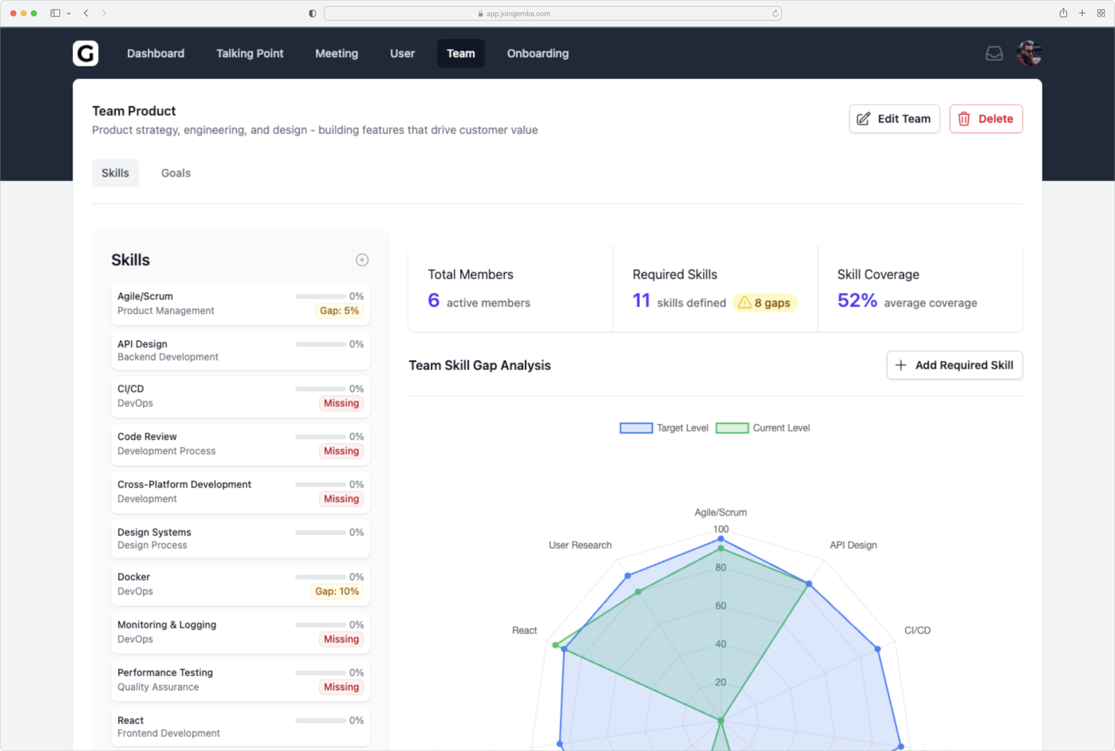 Gemba gibt dir das System, das sich deine Senior Engineers von Tag eins gewünscht hätten — strukturierte 1:1s, Gesprächsthemen die sich von selbst schreiben und Onboarding-Templates die nicht nerven.